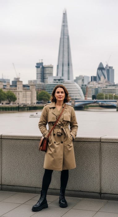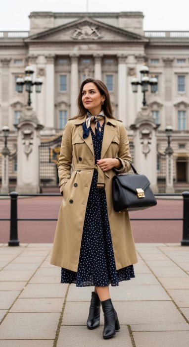 Why It’s Cool: The trench coat is a London essential, and wearing it over a simple dress with ankle boots creates a timeless, sophisticated look. It’s practical for unpredictable weather while maintaining effortless elegance. This is classic London style at its finest.