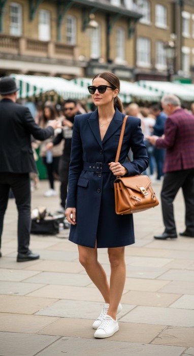 Why It’s Chic: This modern take on the blazer transforms it into a dress that’s both polished and comfortable. Paired with white sneakers and a statement bag, it’s perfect for travel—sophisticated enough for nice dinners yet comfortable for long days of exploring.