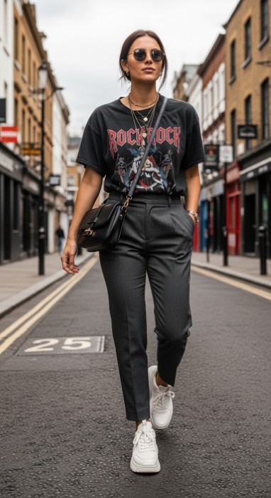 Why It’s Cool: This perfect high-low mix features a vintage band tee that adds personality and edge, paired with tailored trousers for polish and trainers for comfort. It’s the kind of look that says you know how to balance cool and classic—very London.
