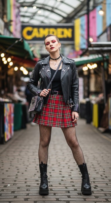 Why It’s Cool: This punk-inspired ensemble channels London’s rebellious fashion heritage. A plaid mini skirt paired with fishnet tights and a perfectly worn leather jacket creates an edgy, confident look that’s pure Camden Market vibes. It’s bold, youthful, and unmistakably London.