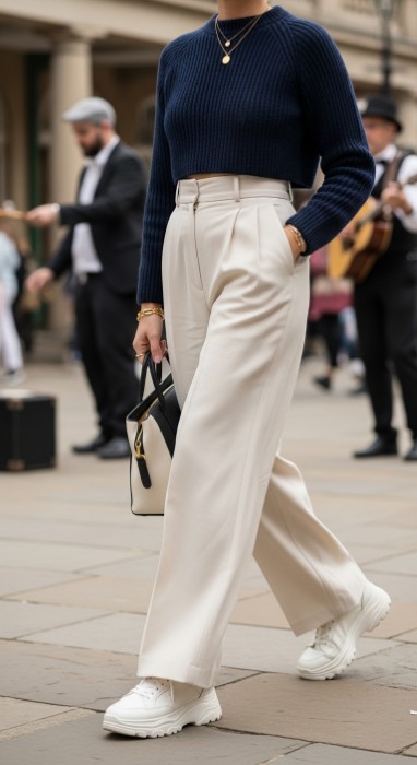 4. Wide-Leg Trousers with Cropped Sweater and Trainers