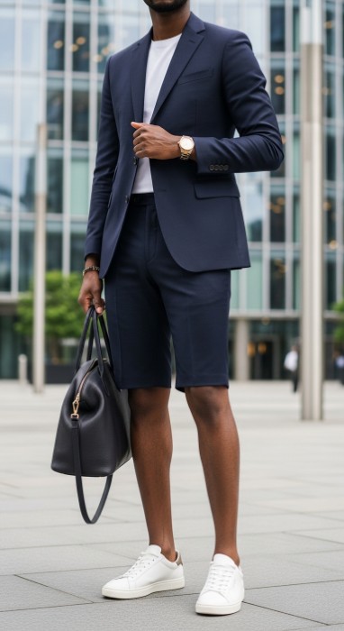 Why It’s Cool: This modern take on the power suit features tailored shorts instead of trousers, making it perfect for summer travel. The matching blazer and shorts in a neutral tone create instant polish while white sneakers keep it relaxed and comfortable. It’s sophisticated yet approachable—very London.
