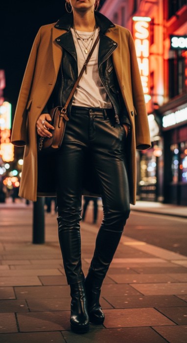 Why It’s Cool: Leather pants might seem unexpected for summer, but lightweight leather or faux leather works beautifully for cool London evenings. Paired with a simple tee and an oversized coat, this look is edgy, comfortable, and perfectly London. The coat can be removed or added as needed for temperature changes.