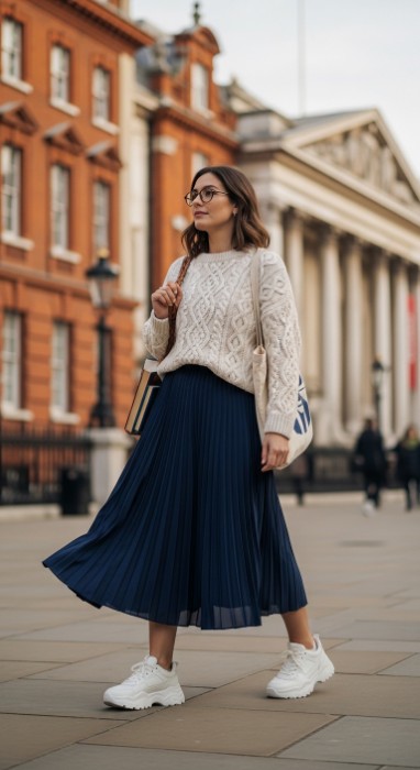9. Pleated Midi Skirt with Chunky Sweater and Trainers