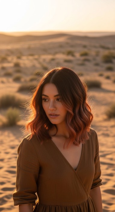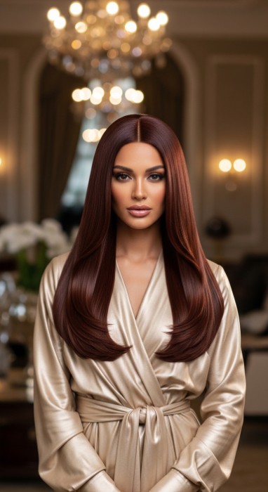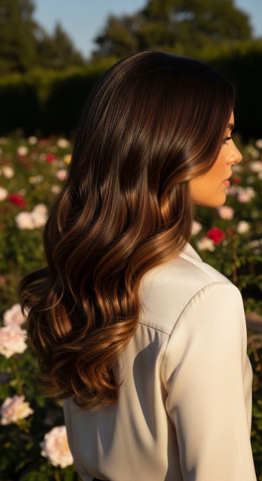 Why It’s Elegant: This warm, earthy technique features a terracotta warmth infusion that adds rich, dimensional depth to dark brown hair. The terracotta tones create a sun-kissed, natural-looking effect that complements warm skin tones beautifully while the glossy finish gives hair a healthy, luxurious appearance. It’s earthy warmth with sophisticated dimension.