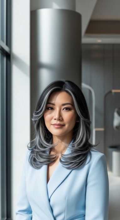 Why It’s Elegant: This cool-toned technique features pearlized ash highlights that add sophisticated, silvery dimension to dark hair. The ash tones create a modern, refined look that’s perfect for cooler complexions while the glossy finish gives the highlights a luminous, pearlescent quality. It’s cool elegance with contemporary appeal.