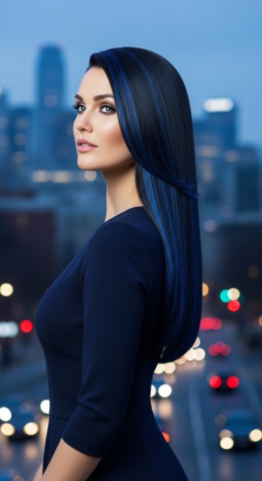 Why It’s Elegant: This sophisticated technique features subtle sapphire blue streaks woven through a jet black base. The blue tones are strategically placed to create depth and intrigue without obvious color while the glossy finish amplifies the jewel-tone effect. It’s mysterious elegance with refined cool edge.