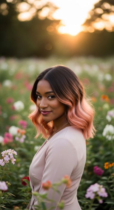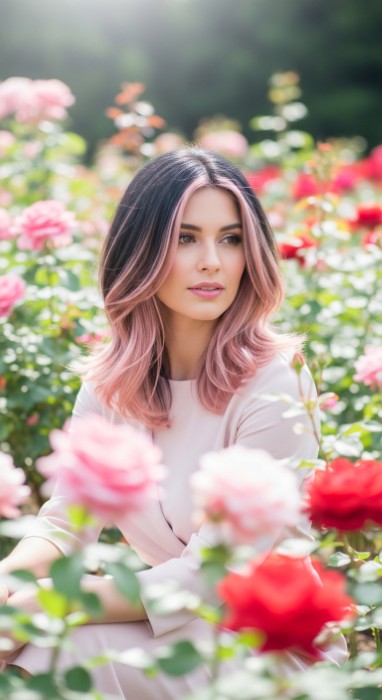 Why It’s Elegant: This flattering technique features rose quartz face-framing pieces that illuminate the complexion against a black base. The soft pink tones add romantic warmth without overwhelming the dark base while the glossy finish gives the highlights a luminous, ethereal quality. It’s feminine elegance with sophisticated softness.