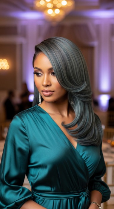 Why It’s Elegant: This playful yet sophisticated technique features vibrant emerald green hidden panels that peek out from beneath a black base. The color is hidden when hair is down but reveals itself with movement, creating surprise and intrigue while the glossy finish amplifies the jewel-tone vibrancy. It’s creative elegance with hidden edge.