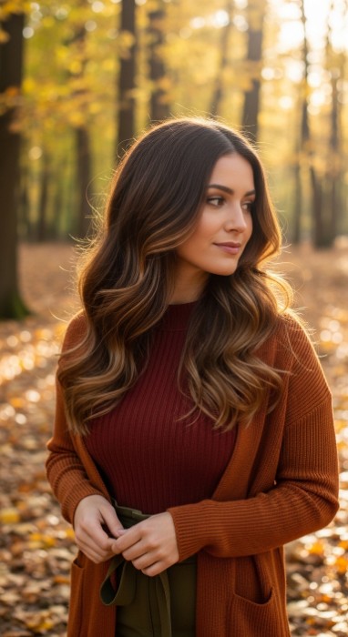 Why It’s Elegant: This seamless technique features a dark chocolate base that melts into honey-bronde tones from mid-lengths to ends. The bronde (brown-blonde) transition is soft and natural-looking, creating dimension that appears sun-lit rather than dyed. The honey tones add warmth and brightness while the chocolate base maintains depth and richness.
