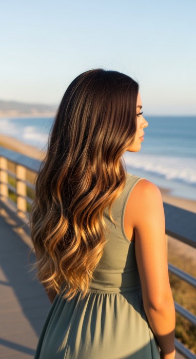 Why It’s Elegant: This seamless technique features a dark brown base with a golden caramel melt that transitions softly from mid-lengths to ends. The melt technique creates a natural, sun-lit effect that grows out beautifully while the glossy finish gives hair a healthy, luxurious appearance. It’s effortless elegance with warm dimension.
