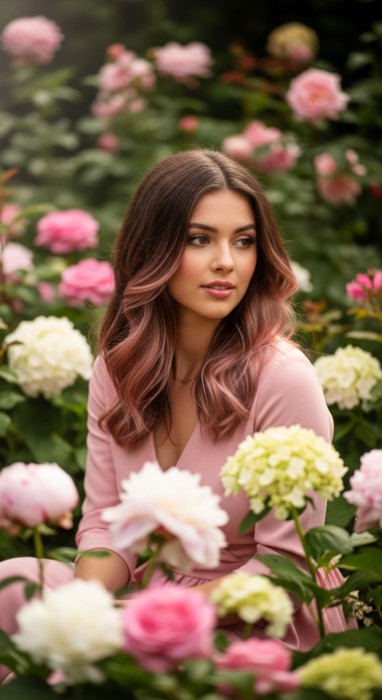 Why It’s Elegant: This romantic technique features ultra-fine rose gold babylights woven through a warm chestnut base. The babylights are so delicate they create a soft, luminous glow rather than obvious streaks. The rose gold tones add warmth and femininity while the chestnut base provides rich depth. It’s subtle romance with sophisticated dimension.