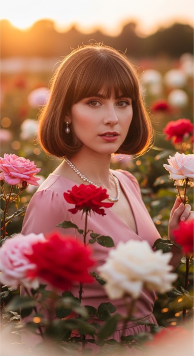 Why It’s Elegant: This romantic bob features a softly rounded shape that frames the face beautifully, paired with effortless curtain bangs that part naturally in the middle. The rounded silhouette is universally flattering, while the curtain bangs add a touch of vintage-inspired charm with modern execution.