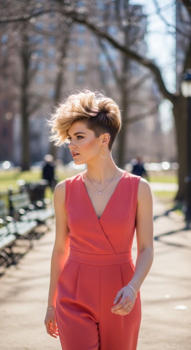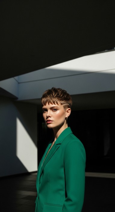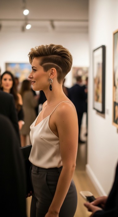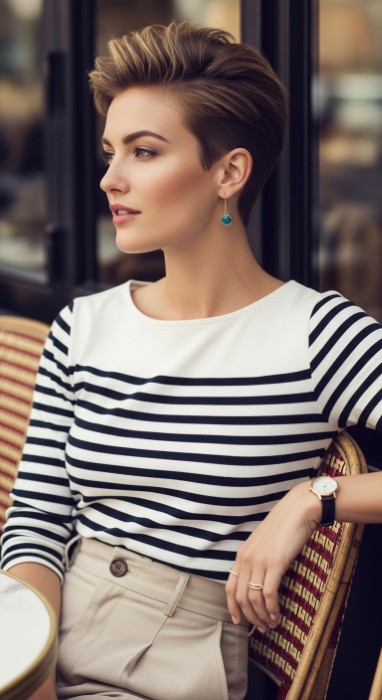 Why It’s Elegant: This refined pixie contrasts textured volume at the crown with sleek, close-cut sides for a sophisticated silhouette. The texturing at the crown adds height and interest while the sleek sides create a polished, elongating effect. It’s a study in balanced contrast that’s incredibly flattering.