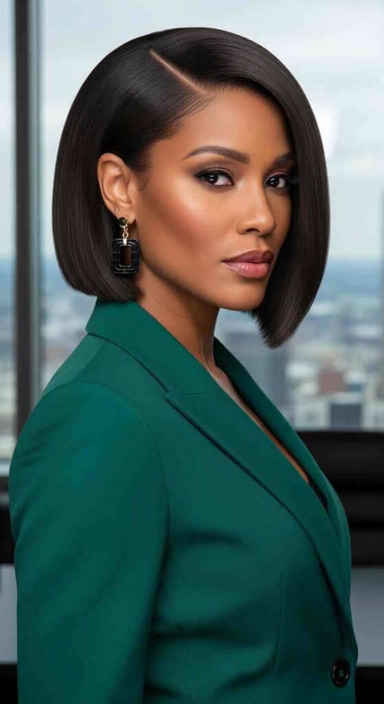 Why It’s Elegant: This sophisticated bob hits right at the earlobe with a deep side part that creates dramatic asymmetry and elongates the face. The sleek, polished finish emphasizes the cut’s precision and creates a powerful, confident silhouette. It’s a bold yet refined look that commands attention.