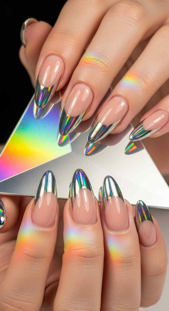 Holographic chrome powder on nail tips creates futuristic shimmer. This technique brings eye-catching dimension and rainbow effects.