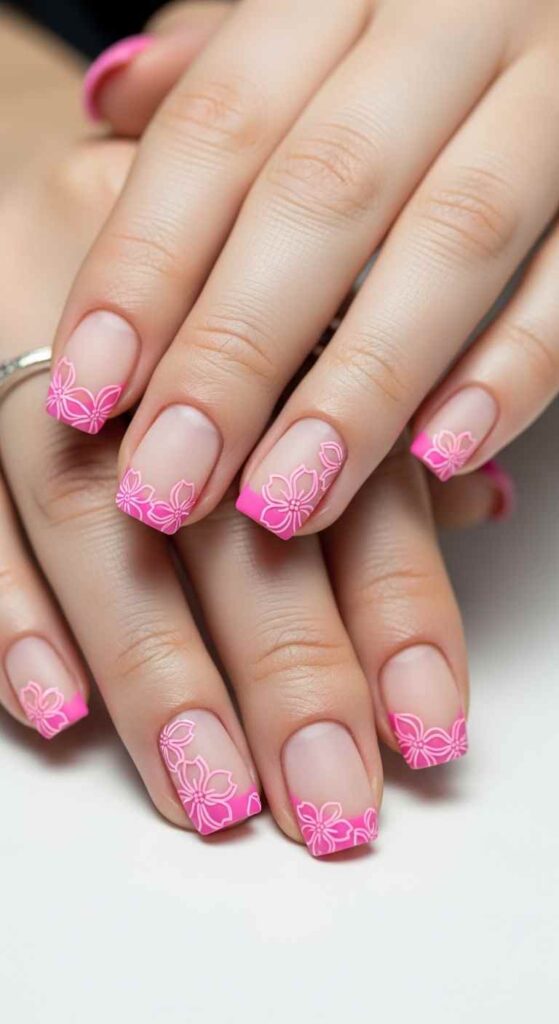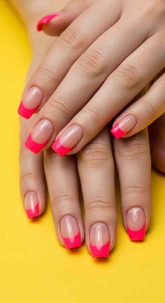 Create traditional French manicure structure with sheer pink or nude base, but replace white tips with neon colors—hot pink, electric yellow, lime green, or orange. Each nail might feature a different neon for rainbow effect, or all tips can match for cohesive brightness. This design bridges classic and contemporary, working for those who love French manicures but want seasonal updates. The neon tips make bold statements while the neutral base grounds the brightness. Professional salons can create precise lines, or use tape guides for DIY attempts.