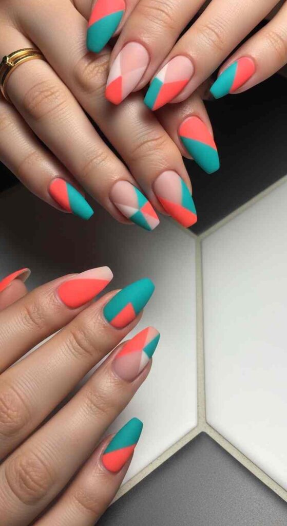 Divide nails into geometric sections—triangles, rectangles, or abstract shapes—painting each section different colors. Use tape or freehand for clean lines. Color combinations might include coral and teal, yellow and purple, or pink and green for spring-summer vibes. This design suits those loving modern, graphic aesthetics. The geometric approach feels intentional and artistic. Works across nail lengths and can be simplified or made complex depending on skill. Tape guides ensure clean lines for DIY attempts.