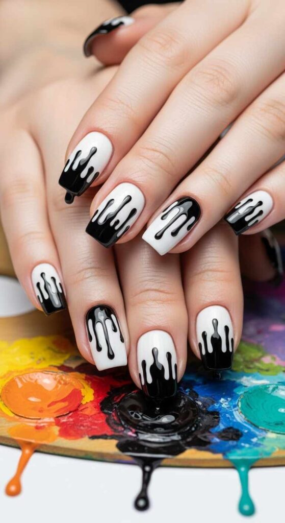 Paint appearing to drip down nails creates modern artistic appeal. This technique brings dynamic movement to static designs.