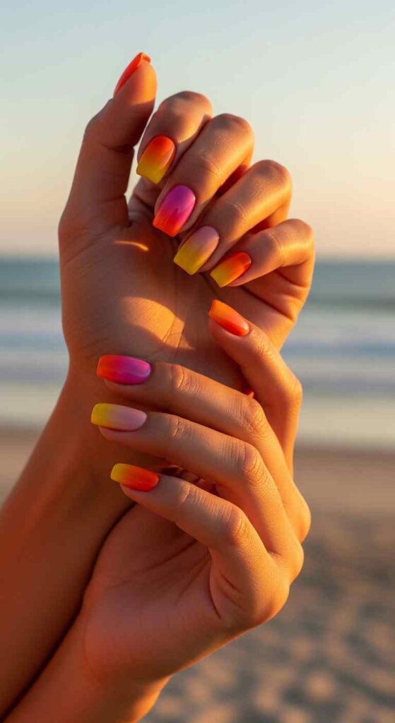 Warm sunset colors blending across nails create golden hour magic. This gradient captures summer’s most beautiful lighting.