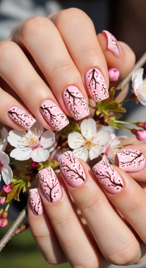 Delicate cherry blossom branches painted across nails bring Japanese-inspired spring beauty. This artistic design celebrates the season’s most iconic bloom.