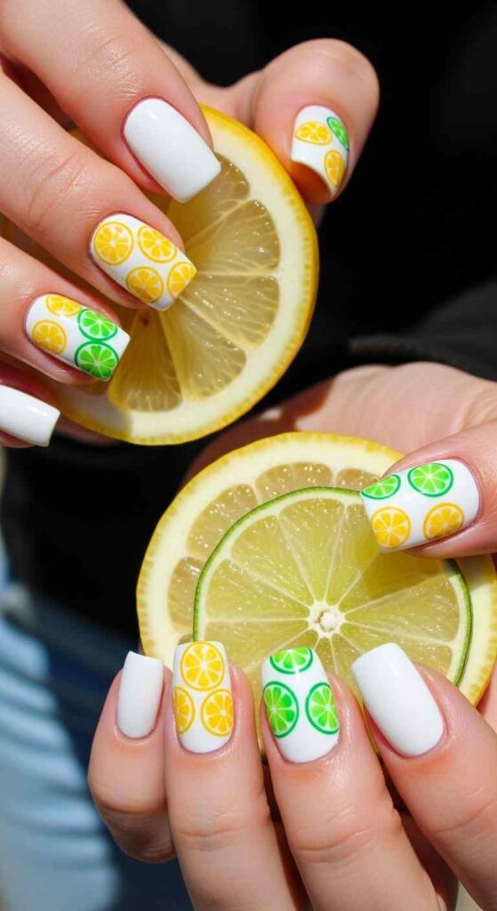 Paint nails in bright white or yellow as a base. On accent nails, paint cross-sections of citrus fruits—circular shapes with segmented interiors and colored rinds. Lemons (yellow), limes (green), and oranges (orange) create varied effects. Small seeds and highlights add realism. This design works for those wanting playful, fun nail art. The fruit theme feels perfectly summery and cheerful. Achievable with dotting tools and thin brushes, or simplified with nail stickers.