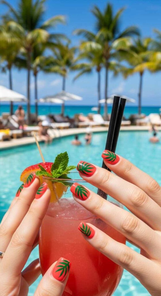 Paint nails in bright summer colors—coral, turquoise, or sunshine yellow. Add bold green palm leaf designs—these can be simplified silhouettes or detailed fronds. The contrast between bright base and green leaves creates tropical energy. This design works for those wanting vacation aesthetics year-round. The palm theme feels perfectly summery and exotic. Achievable with nail art brushes or using palm leaf stickers for easier application.