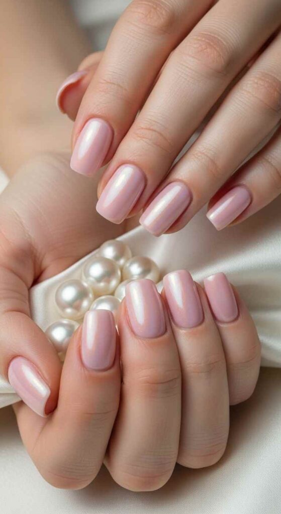Apply pearlescent polish in soft colors—pearl pink, opalescent white, or iridescent lavender—creating subtle shimmer that shifts with movement. The pearl finish adds dimension without being as bold as glitter or chrome. This design suits those wanting elegant shimmer that works across settings. The pearlescent quality feels sophisticated and grown-up. Available in regular polish, making it accessible for home application.