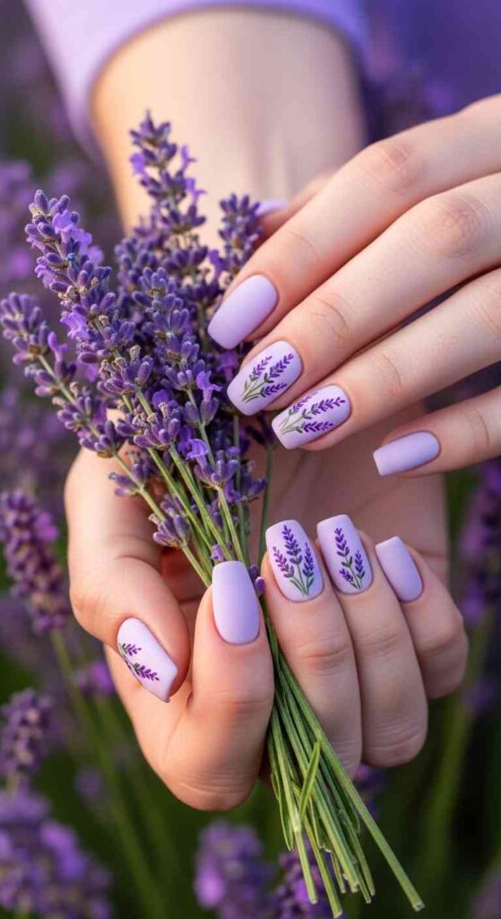 Paint nails in soft lavender shades—from pale lilac to medium purple. On accent nails, add tiny hand-painted lavender sprigs—simple vertical stems with small purple flowers. The delicate botanical details add romantic charm. This design works for those loving purple tones and botanical themes. The lavender inspiration feels calming and elegant. Achievable with thin brush for sprigs or using lavender nail stickers.