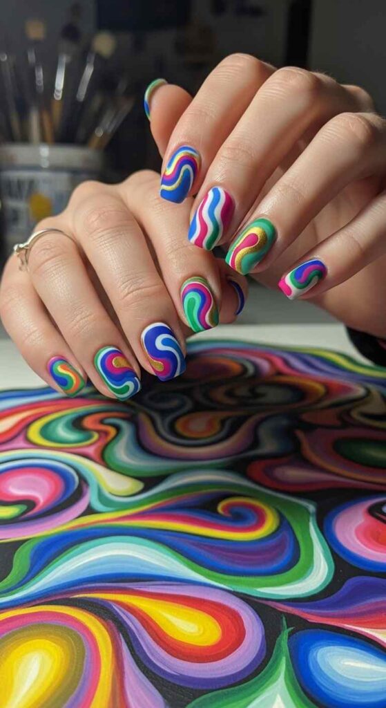 Using water marbling or direct painting, create tie-dye effects with multiple bright colors swirling together. Rainbow combinations or specific color families both work. The organic swirls mimic fabric tie-dye patterns. This design suits those loving retro aesthetics and bold color. The technique creates unique patterns on each nail. Achievable with various marbling methods or freehand swirl painting.