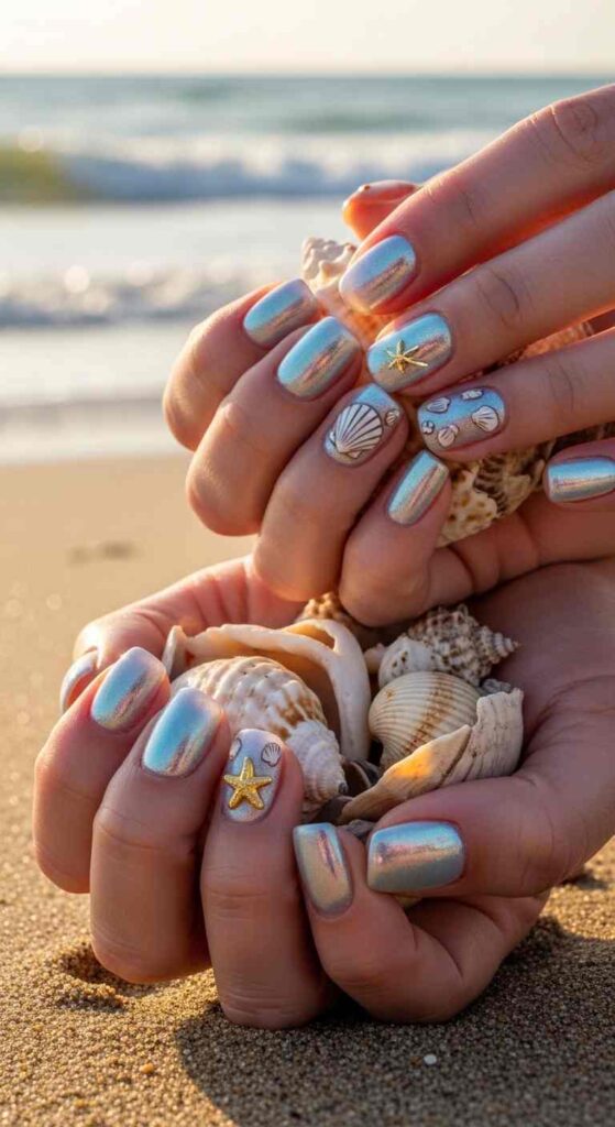 Apply pearlescent or iridescent base polish creating mother-of-pearl effects. Add tiny hand-painted shells—conch, scallop, or starfish—on accent nails. Small pearls or shell charms can be applied for dimensional elements. This design works for beach lovers and coastal aesthetics. The shimmer mimics natural shell iridescence. Achievable with iridescent polishes and thin brushes for shell details.
