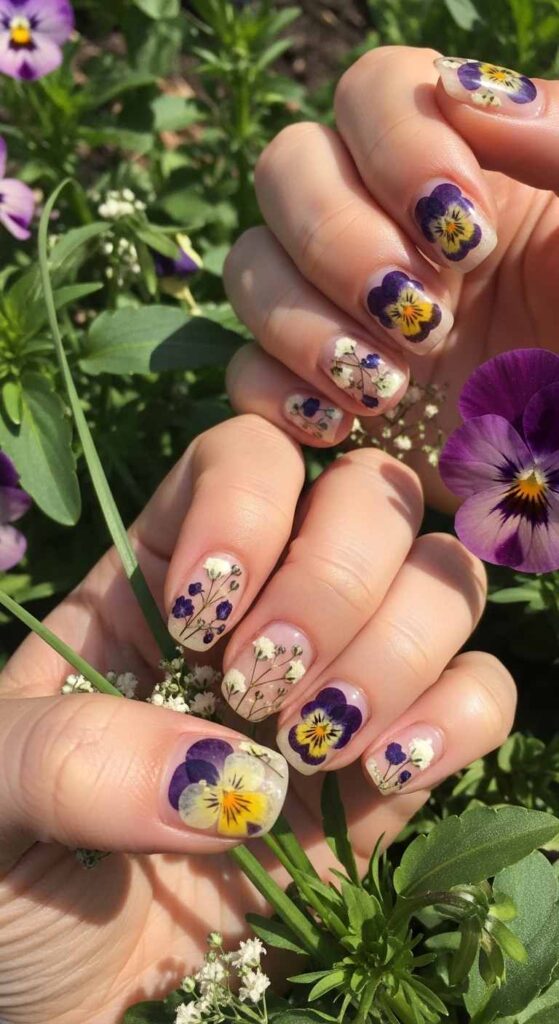Actual dried flowers sealed under clear polish create botanical beauty. This technique brings real nature onto nails.