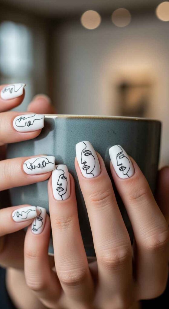 On nude or white bases, paint simple line art faces—abstract Picasso-inspired profiles or minimalist line drawings. The faces might be continuous lines or simple features. This design suits those loving modern art and minimalist aesthetics. The artistic approach feels sophisticated and gallery-worthy. Requires steady hand for clean lines or using nail art pens designed for detailed work.