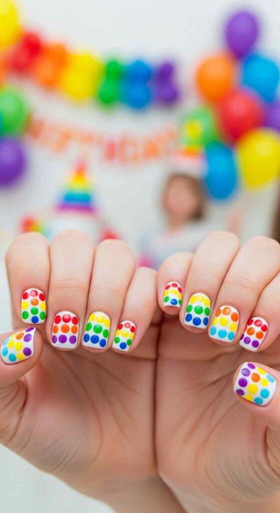 Using dotting tools, apply rainbow-colored dots across nails in patterns—organized grids, random scatter, or gradient arrangements. The dots might all be same size or vary. This design suits those wanting colorful, playful nails achievable at home. The dot technique is beginner-friendly while creating professional-looking results. Works with any color combination and pattern variation.