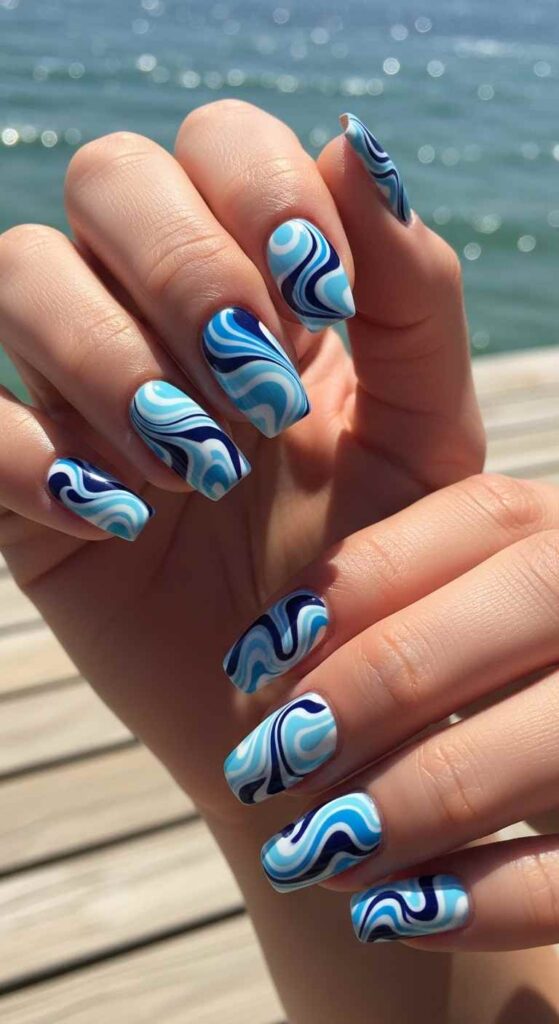Swirled blue and white polish creates oceanic wave effects. This technique brings beachy vibes perfect for summer transitions.
