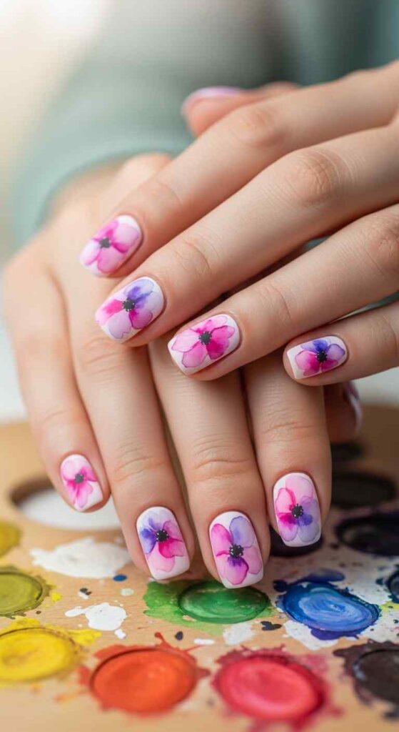 Soft, blurred watercolor flowers create artistic, painterly effects. This technique brings fine art aesthetics to nail design.