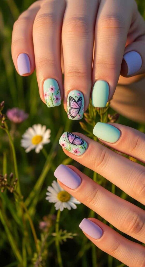 Paint nails in soft spring colors—perhaps mint, lavender, and peach. On accent nails, add small hand-painted butterflies or use butterfly nail stickers for easier application. The butterflies might be simple silhouettes or detailed illustrations depending on skill level. Scatter tiny flowers or dots as additional garden elements. This design works for those loving feminine, nature-inspired art. The garden theme feels perfectly seasonal while butterflies add movement and life. Achievable with nail art pens or fine brushes.