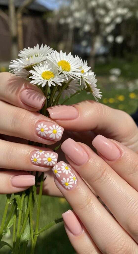 Paint nails in nude, soft pink, or white as a base. On one or two accent nails, paint simple white daisies with yellow centers—these don’t need to be perfect, hand-painted charm adds to their appeal. Small daisies scattered across the nail or a single larger daisy create different effects. This design works for those wanting floral elements that remain delicate and wearable. The neutral base keeps it versatile while daisies add seasonal personality. Simple enough for DIY attempts with a dotting tool and thin brush.