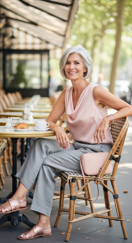 Why It Works: The soft gray and blush pink combination is gentle and flattering. Linen pants with a drawstring waist offer comfort without sacrificing style. Silk top adds luxury. Rose gold accessories complement the blush tones beautifully. Perfect for brunch, shopping, or casual social events.