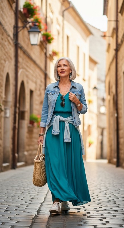 Why It Works: Teal is a stunning color that looks vibrant on mature skin. The maxi dress is comfortable and elegant. Adding a denim jacket makes it casual and practical for cooler evenings. White sneakers keep it modern and comfortable for walking. Ideal for travel, outdoor events, or casual weekends.