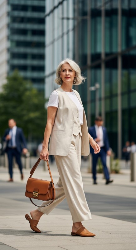Why It Works: Matching sets are effortlessly chic and sophisticated. The vest adds structure and polish. Cream is elegant and versatile. Wide-leg trousers are comfortable and flattering. This monochromatic look is perfect for professional settings, lunch meetings, or upscale casual events.