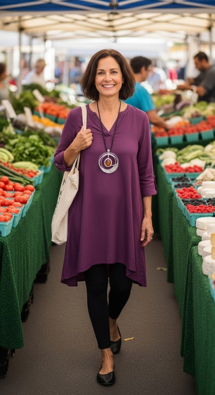 Why It Works: Plum is a rich, flattering color that’s perfect for mature women. The tunic dress provides comfortable coverage. Ponte leggings are comfortable and polished. This combination is ideal for running errands, casual outings, or travel. The pendant necklace adds interest and draws attention upward.
