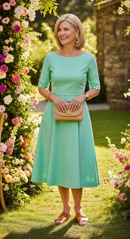 Why It Works: Mint green is fresh and youthful without being inappropriate. The A-line silhouette is universally flattering. The modest neckline and sleeve length are age-appropriate. Leather sandals provide comfort and style. Perfect for garden parties, weddings, or spring-to-summer events.