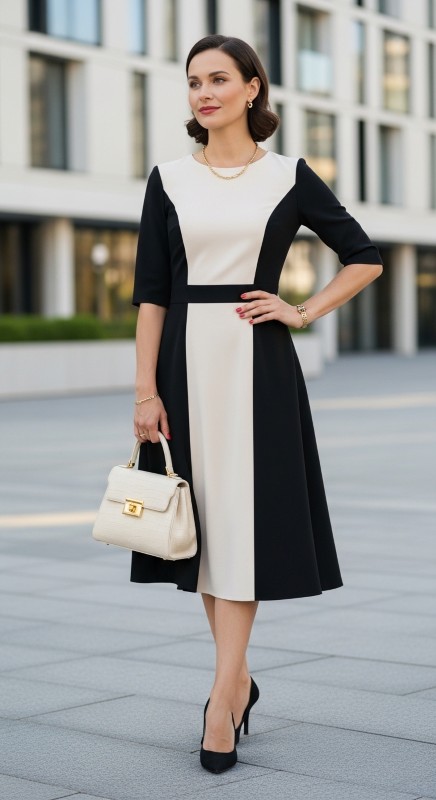 The Look: A sophisticated black and cream color-block dress with strategic paneling, paired with black pumps, a cream handbag, and simple gold jewelry.
