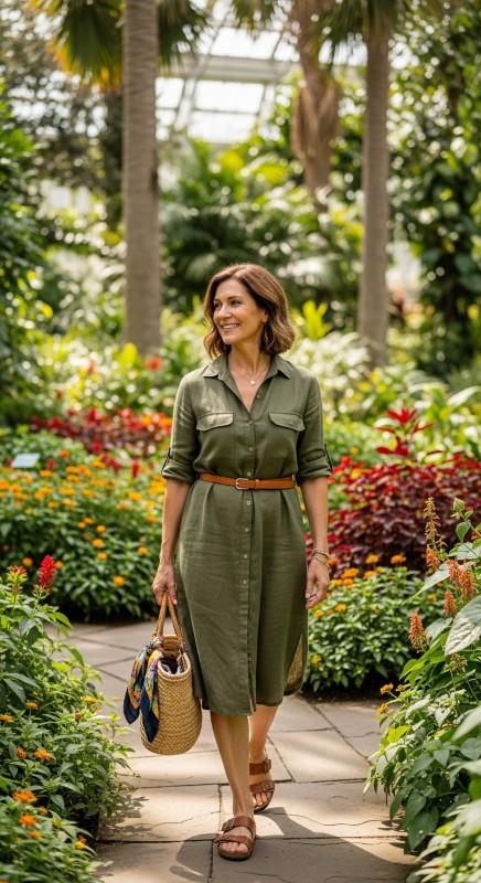 The Look: An olive green linen shirtdress with rolled sleeves, cinched with a tan leather belt, paired with brown leather sandals and a woven tote.