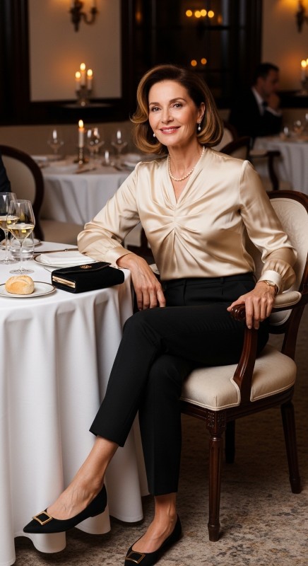 Why It Works: Champagne silk is luxurious and elegant. The draping adds interest and flatters the figure. Black trousers are timeless and versatile. This combination is perfect for evening events, dinners, or special occasions. It’s sophisticated and refined.