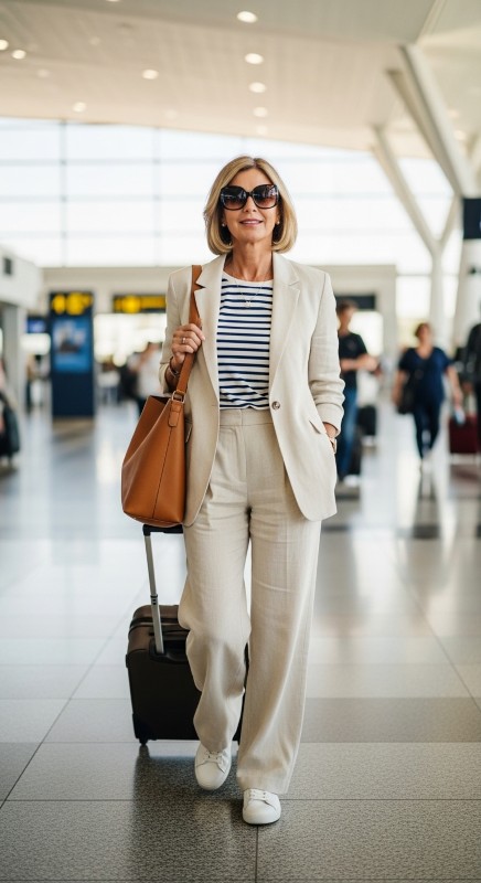 Why It Works: The pantsuit is sophisticated and put-together. Adding a striped tee casualizes it appropriately. Linen is perfect for summer. White sneakers keep it modern and comfortable. This look is ideal for travel, casual Fridays, or weekend outings.
