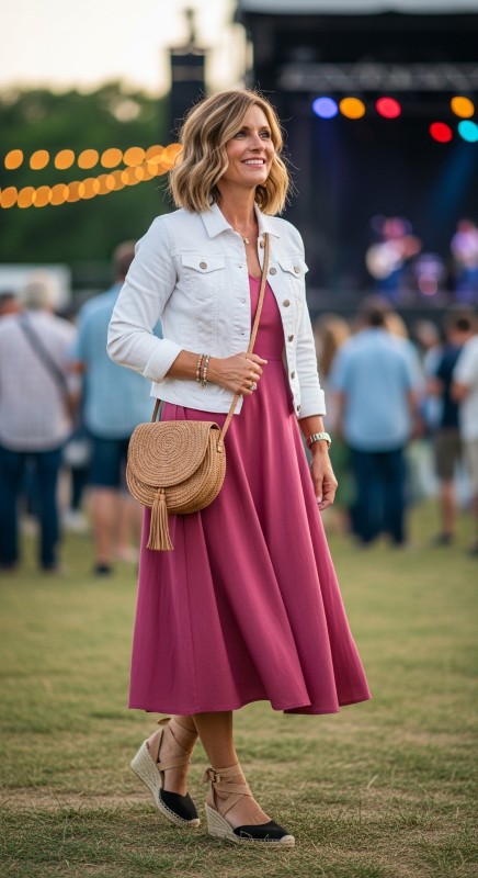 Why It Works: Deep rose is a beautiful, flattering color. Jersey fabric is comfortable and drapes well. The white denim jacket adds casual coolness. This combination is perfect for outdoor events, concerts, or casual gatherings. It’s comfortable yet stylish.