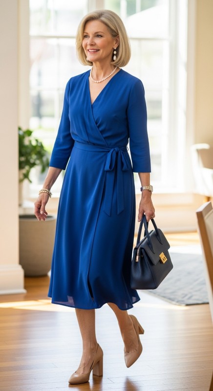 The Look: A sophisticated sapphire blue wrap dress in jersey fabric hitting below the knee, paired with nude block-heel pumps, pearl stud earrings, and a structured navy handbag.