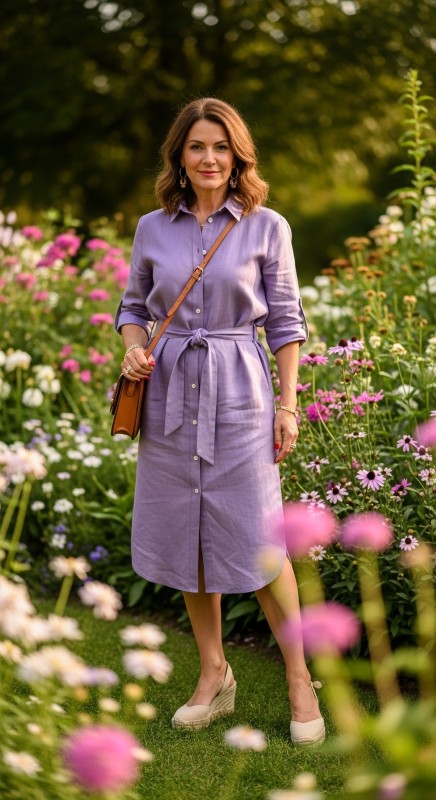 Why It Works: Dusty lavender is a soft, age-appropriate color that’s both fresh and sophisticated. The shirt dress style is versatile and easy to wear. Linen keeps you cool in summer heat. Espadrille wedges provide height and comfort while maintaining a relaxed vibe. This look is ideal for garden parties, outdoor concerts, or casual weekends.